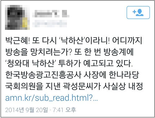 소식을 접한 네티즌들은 “‘관피아’ 대신 ‘박피아’ 커지는 적폐!”(@jk_spa**), “박근혜, 또 다시 ‘낙하산’이라니. 어디까지 방송을 망치려는건가?”(@moziri**), “이제 언론장악의 마무리를 위해 정보기관 프락치로서의 역할이 남은 건가?”(@sbm94***) 등의 반응을 보였다.