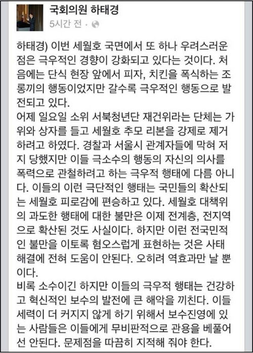 하태경 새누리당 의원은 자신의 SNS에 “이들 극소수의 행동은 자신의 의사를 폭력으로 관철하려고 하는 극우적 행태에 다름 아니다”라며 “전 국민적 불만을 이토록 혐오스럽게 표현하는 것은 사태 해결에 전혀 도움이 안 된다. 오히려 역효과만 날 뿐”이라는 글을 게시했다.