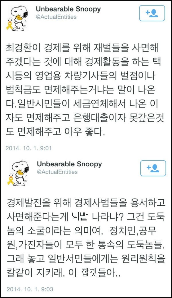 또 “재벌총수가 경제부양에 대해 구체적 각서를 쓰면 몰라도 아니면 말자! 국민은 이미 이명박 대통령의 경제발전공약에 사기를 당한 바 있고, 기업은 100조가 넘는 유보금에도 고용을 유보해왔다. 이 나라엔 학습효과 따위란 없단 말인가?”(@asi****), “ 재벌총수님 감옥 가시면 기업 경영에 큰 어려움 생기지만, 앓아 누우시면 기업에 문제없다 발표합니다. 인체의 신비”(@old****)라는 반응도 보였다.