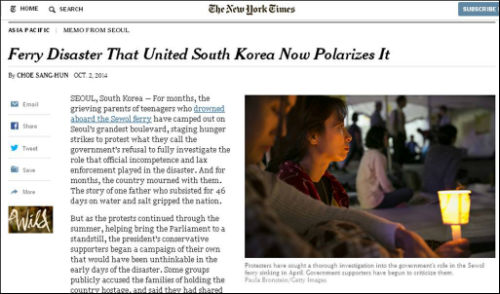 <NYT>는 “이것은 세월호 침몰 이후 5개월 이상 한국을 슬픔 속에 하나로 뭉치게 했던 참사가 이제 친숙한 진보·보수 선을 따라 국가를 반으로 나누고 박근혜 대통령의 정치적 안건들을 틀어지게 할 위협을 주며 국가를 양분화시키고 있다는 또 다른 신호”라고 전했다.