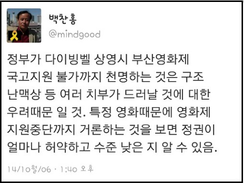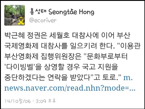 한편, <다이빙벨>은 관객들과의 만남에 성공했지만 ‘상영취소’ 압박에 이어 이번에는 부산영화제에 대한 정부의 ‘국고지원 중단설’까지 보도돼 논란이 끊이지 않고 있다.