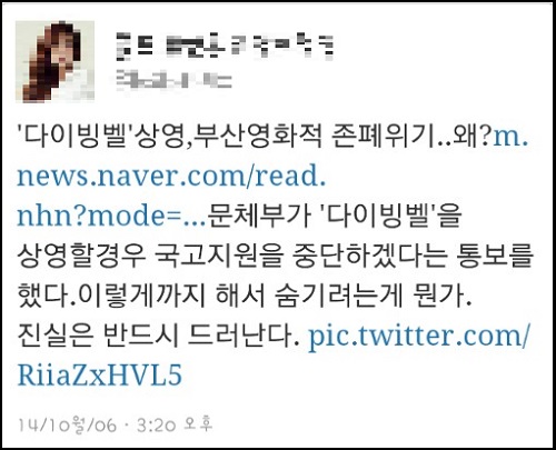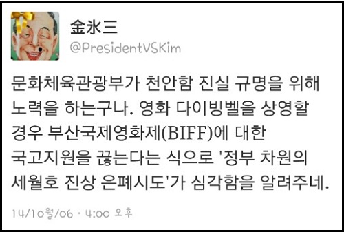 이날 일부 인터넷 언론은 “19회를 맞은 부산국제영화제가 존폐 위기를 맞았다”면서 부산영화제 측이 “문화체육관광부로부터 ‘다이빙벨’을 상영할 경우 국고 지원을 중단하겠다는 통보를 받았다”고 보도했다.