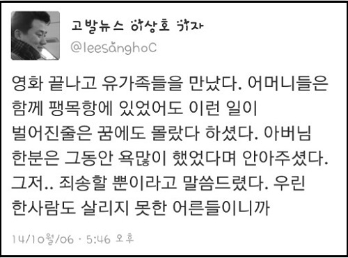 이날 이상호 기자는 영화상영 및 관객과의 대화 직후 자신의 트위터에 “영화 끝나고 유가족들을 만났다”며 후기를 남기기도 했다.