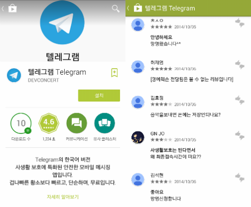 때문에 국내 메신저 이용자들의 외국 메신저인 텔레그램으로 ‘사이버 망명’이 이어지고 있는 추세다. 앱 통계 분석 업체인 ‘앱 애니’의 집계를 보면, 6일 기준 텔레그램의 다운로드 순위는 아이폰 소셜분야에서 검찰 발표가 있기 전 110위에서 1위로 뛰어올랐다. 안드로이드 커뮤니케이션 분야에서도 2위를 기록했다.