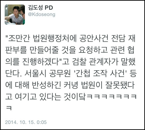 이 소식을 접한 네티즌들은 “현재 박근혜 정부에서는 전 국민 간첩 만들기 프로젝트가 진행 중입니다. 유우성 간첩 만들기에 실패하자 이제 검찰·국정원이 ‘공안전담 재판부’를 만들려 하고 있다고 합니다. 유신재판 부활합니다”(@doa****), “위조인줄 알면서 제출한 검사에 대한 징계 재판부도 신설해야죠?”(@hee****), “참 가지가지 한다. 국정원이 끼지 않는 곳이 없네. 국정원 개혁은 어디 갔냐?”(@caf****), “진짜간첩 의심되는 사안은 조사조차 하지 않고 엉뚱한 사람 간첩으로 몰아 증거조작이나 하는 검찰이 재판부가 문제라고? 수사기관이 재판부까지 좌지우지 하겠다는 건가?”(@688****)라며 강하게 반발하고 나섰다.