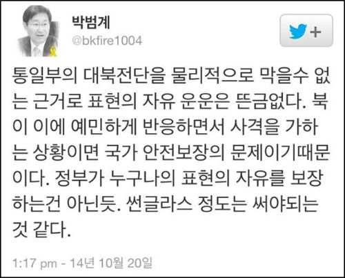 박범계 새정치민주연합 의원은 “표현의 자유 운운은 뜬금없다”며 “정부가 누구나의 표현의 자유를 보장하는 건 아닌 듯. 썬글라스 정도는 써야 되는 것 같다”고 비꼬았다.