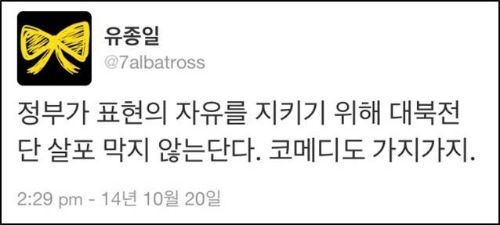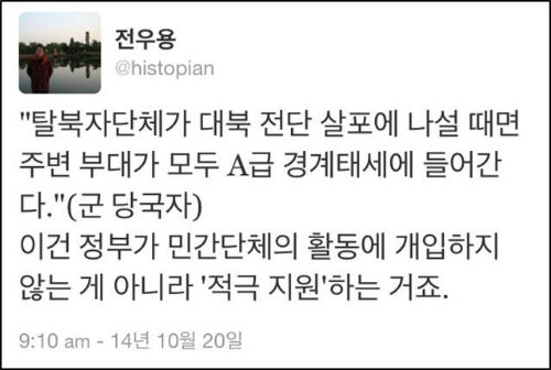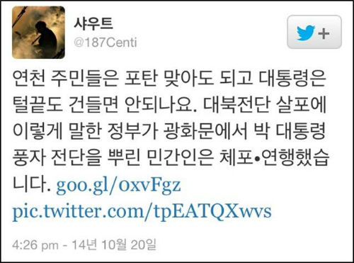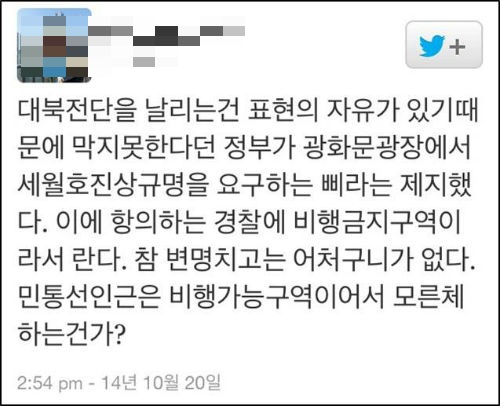 한 트위터리안은 이날 광화문에서 박근혜 대통령 풍자 포스터를 살포해 경찰에 연행된 이하 작가를 언급 하며 “대북전단 살포에 이렇게 말하는 정부가 광화문에서 풍자 전단 뿌린 민간인은 체포·연행했습니다”라고 꼬집었다.