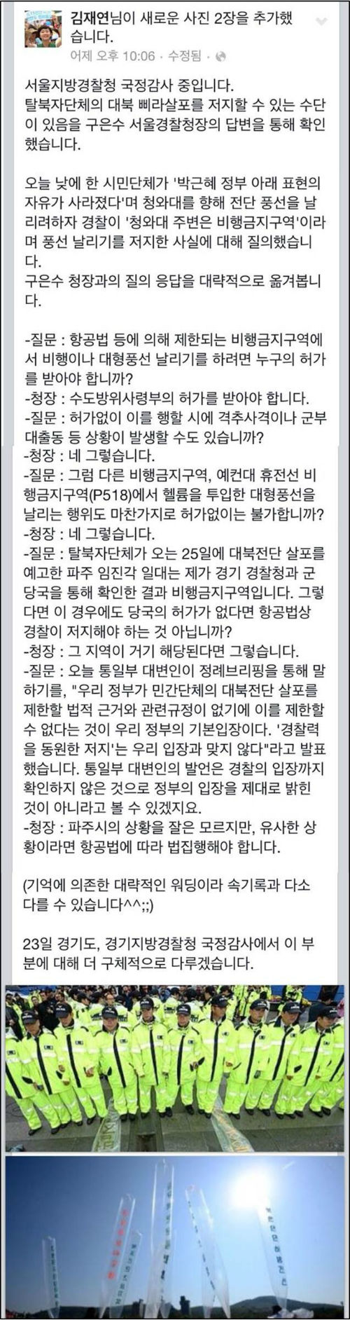 해당 글에 따르면, 김 의원은 탈북자 단체가 오는 25일 대북전단 살포를 예고한 파주 임진각 일대가 비행금지구역인 것과 관련해 ‘당국의 허가가 없다면 항공법상 경찰이 저지해야 하는 것 아니냐’고 구은수 서울경찰청장에게 질의하자 구 청장은 “그 지역이 거기 해당된다면 그렇다”고 관련 규정에 대해 확인했다.