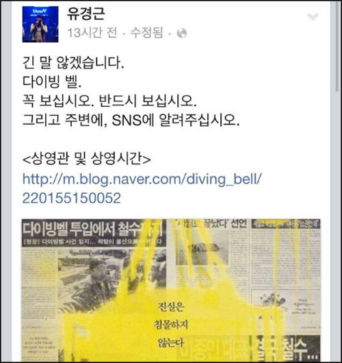 특히 세월호 가족대책위원회 유경근 대변인은 상영정보가 담긴 글을 자신의 페이스북에 링크하고 “꼭 보십시오. 반드시 보십시오”라고 추천했다.