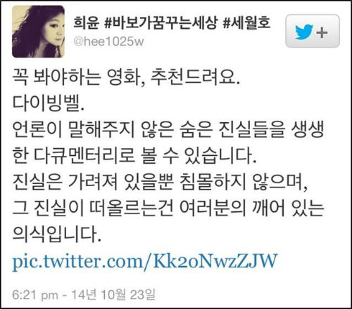 한편, <다이빙벨>은 ‘go발뉴스’ 이상호 기자와 다큐 저널리스트 안해룡 감독이 의기투합한 작품으로 제19회 부산국제영화제에 초청됐으며 상영 당시부터 큰 화제를 불러일으킨 바 있다.