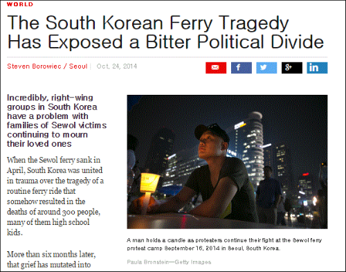 미국의 시사주간지 타임지가 세월호 참사 이후 양극화된 한국 사회에 대해 보도하면서 “한국의 우익단체들은 사랑하는 가족을 잃고 애도하는 세월호 희생자 유족들을 못마땅해 한다”며 이들에 비판적인 시각을 드러냈다.