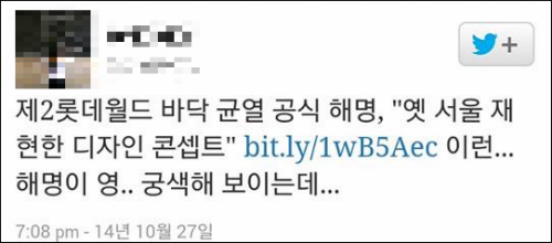 롯데건설은 롯데월드몰 5층과 6층 식당가 바닥에 생긴 균열과 관련해 “1920년대부터 80년대 서울의 분위기를 재현하기 위한 디자인 콘셉트로 구조적 균열이 아니며, 안전과 무관하다”고 27일 밝혔다.
