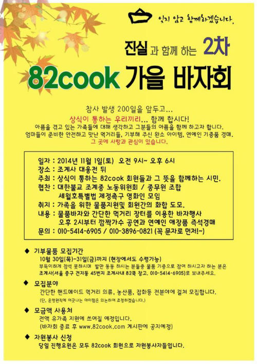 세월호 유가족들과 진실규명을 함께 하며 안전한 사회를 만들기 위한 ‘진실과 함께하는 82cook 가을 바자회’가 또 한번 개최된다.