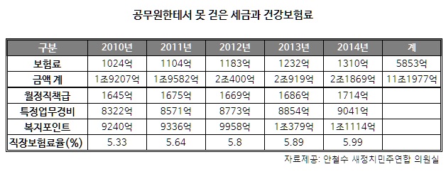 새정치민주연합 안철수 의원이 28일 국민건강보험공단으로부터 제출받은 자료에 따르면 전국 모든 공무원에게 지급된 복지포인트, 월정직책급(직책수당), 특정업무경비(특수활동비)가 최근 5년간 모두 10조1977억원인 것으로 나타났다.