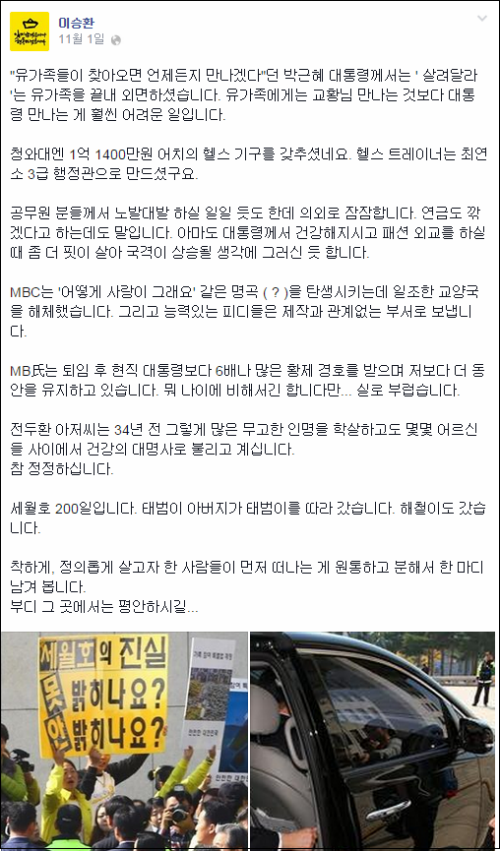 세월호 참사 200일째인 지난 1일 이씨는 페이스북을 통해 “‘유가족들이 찾아오면 언제든지 만나겠다’던 박근혜 대통령님께서는 ‘살려달라’는 유가족들을 끝내 외면하셨습니다”라며 “유가족에게는 교황님 만나는 것보다 대통령 만나는 게 훨씬 어려운 일입니다”라며 두 장의 사진을 함께 게재했다.