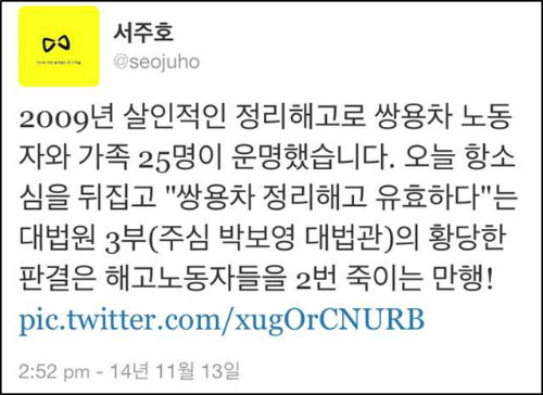 쌍용자동차가 경영상의 이유로 노동자를 정리해고한 것이 정당하다고 대법원이 판결을 내린 것과 관련, 파워트위터리안 등 SNS 에서도 비판 목소리가 높아지고 있다.