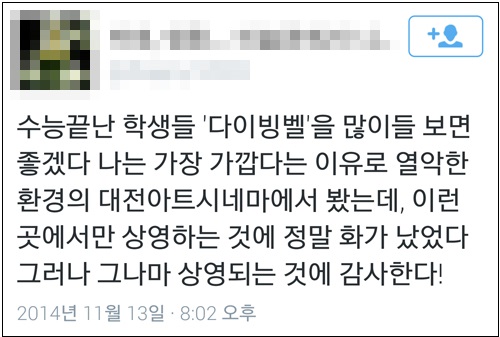 <다이빙벨>에 대한 10대들의 관심은 SNS상에도 고스란히 드러나고 있다. 트위터에는 “수능 친 고3분들 다이빙벨 한번 보러가세요”(@canyou***), “수능 끝나자마자 극장으로 달려왔어요. 친구랑 다이빙벨 보러 갑니다”(@fromkr***), “수능 끝나고 나서도 다이빙벨 부산에서 계속 상영했으면 좋겠어요”(@ikny***) 등의 반응이 잇따랐다.