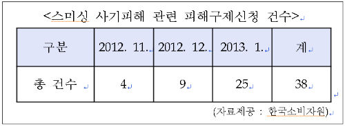 앞서 한국소비자원이 7일 발표한 ‘스미싱 사기피해 관련 피해구제신청 건수’에 따르면, 스미싱 피해는 작년 11월 4건에서 올 1월 25건으로 3개월 사이에 8배 이상 증가했다. 11일 금융결제원은 파밍으로 인해 공인인증서 700개가 유출됐다고 발표했다. 15일 카드업계에 따르면, 카드사 콜센터에 1월부터 2월 중순까지 피싱, 파밍, 스미싱 등에 의한 개인정보 유출 상담사례는 1000건에 달하는 것으로 추정된다.