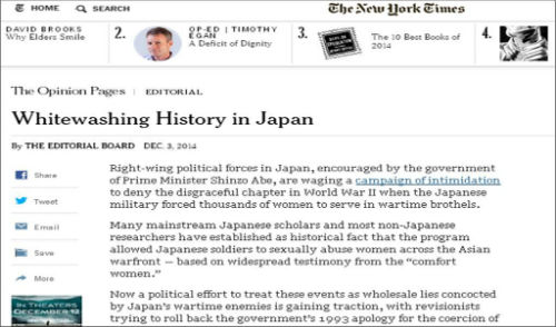 <NYT>는 사설에서 “아베 정부에 의해 고무된 일본 우익세력은 일본군이 수천 명의 여성을 강제로 끌고간 제2차 세계대전의 불명예스러운 역사를 부정하고자 위협을 가하는 운동을 전개하고 있다”고 밝혔다.