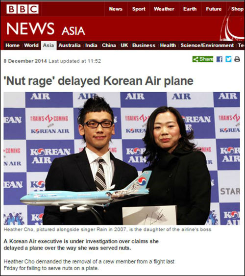 | 다음은 <BBC> 해당 기사 전문 번역 감수 : 임 옥 ‘Nut rage’ delayed Korean Air plane Heather Cho, pictured alongside singer Rain in 2007, is the daughter of the airline's boss A Korean Air executive is under investigation over claims she delayed a plane over the way she was served nuts. Heather Cho demanded the removal of a crew member from a flight last Friday for failing to serve nuts on a plate. Ms Cho, a vice-president of the firm, forced the Incheon-bound flight to taxi back to the terminal in New York. The airline said checking service standards was part of her job, and she had the pilot's backing. But officials said she was a passenger at the time. Local media reports said that a junior attendant had offered Ms Cho macadamia nuts in a bag, instead of serving the nuts on a plate. Ms Cho, daughter of company boss Cho Yang-ho, then questioned the chief flight attendant over in-flight service standards and ordered him off the plane. Korean Air said the plane arrived 11 minutes late, and that the decision to expel the senior flight attendant had been made in consultation with the pilot. The airline told Korea Times that checking of quality of service was one of Ms Cho's jobs, as she is in charge of in-flight service for the carrier. The transport authorities are investigating whether Ms Cho's actions infringed aviation law. "Even though she is senior vice president at the company, she was a passenger at that time, so she had to behave and be treated as a passenger," a South Korea transport ministry official told reporters. |
