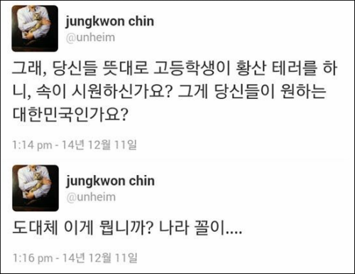 진 교수는 11일 트위터를 통해 “일베하다가 테러까지..? 우려했던 일이 현실화”라면서 “설사 그들의 생각에 동의하지 않더라도, 그들이 그 생각을 말할 자유만은 줘야한다. 그게 민주주의의 원칙”이라고 밝혔다.