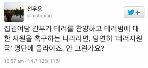 이에 역사학자 전우용 씨는 “집권여당 간부가 테러를 찬양하고 테러범에 대한 지원을 촉구하는 나라라면, 당연히 ‘테러지원국’ 명단에 올려야죠. 안 그런가요?”라고 꼬집었다.
