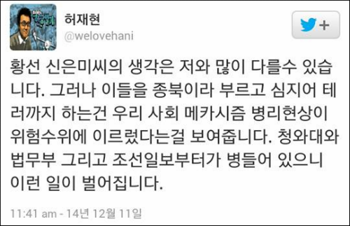이어 “결국 이 나라에서도 정치적 테러가 일어난 셈”이라며 “그 배경은 연일 살벌한 인민재판을 벌여온 조선과 동아 두 종편이 이 사회에 조성해온 극우 분위기라고 본다”고 분석했다.