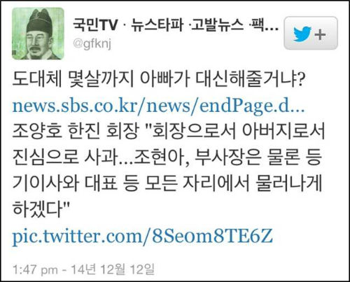 조 회장의 사과에 네티즌들은 “딸내미 나이가 40인데 본인은 코빼기도 안 내밀고 아빠가 대신 사과하네”(Atti***), “딸이 잘못했는데 왜 아비가 사과를?”(스미**), “법대로 했으면 좋겠네요”(엉**), “딸 나이가 40인데 무슨 중고등학생들 사고 쳤을 때처럼 부모가 와서 사과를 하나요?”(로그아***), “자식은 부모의 거울”(ivy**), “왜 너그러워야 하는지부터 설명 좀”(미포***), “이게 무슨 의미가 있을까요”(셔니**) 등의 비난 반응들을 보였다.
