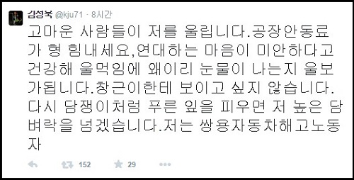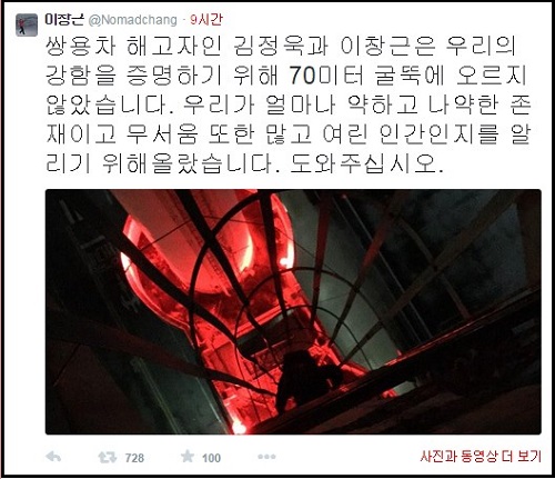 이창근 기획실장도 이날 자신의 트위터에 “쌍용차 해고자인 김정욱과 이창근은 우리의 강함을 증명하기 위해 70미터 굴뚝에 오르지 않았다”면서 “우리가 얼마나 약하고 나약한 존재이고 무서움 또한 많고 여린 인간인지를 알리기 위해 올랐다”면서 ‘도와달라’고 호소했다.