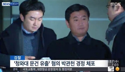 검찰이 16일 밤 11시 40분경 박관천(48) 경정을 대통령기록물관리법 위반과 공용서류 은닉 혐의로 체포했다.