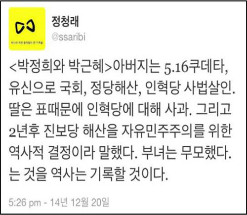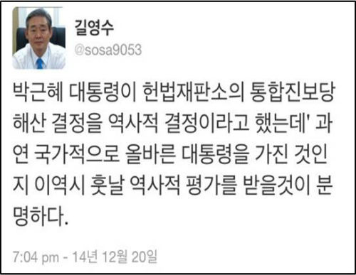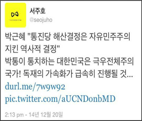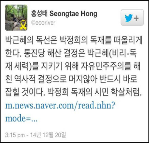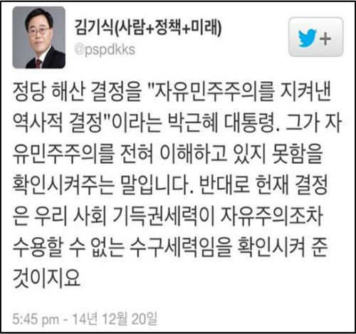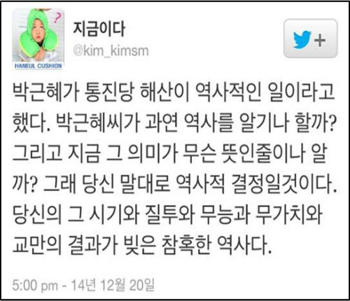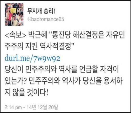박근혜 대통령이 20일 통합진보당 해산 결정에 대해 “자유민주주의를 확고하게 지켜낸 역사적 결정”이라고 평가한 것과 관련, SNS 등에서는 이같은 입장을 두고 ‘유신의 부활’, ‘참혹한 역사의 회귀’ 등의 비판 반응들이 잇따르고 있다.