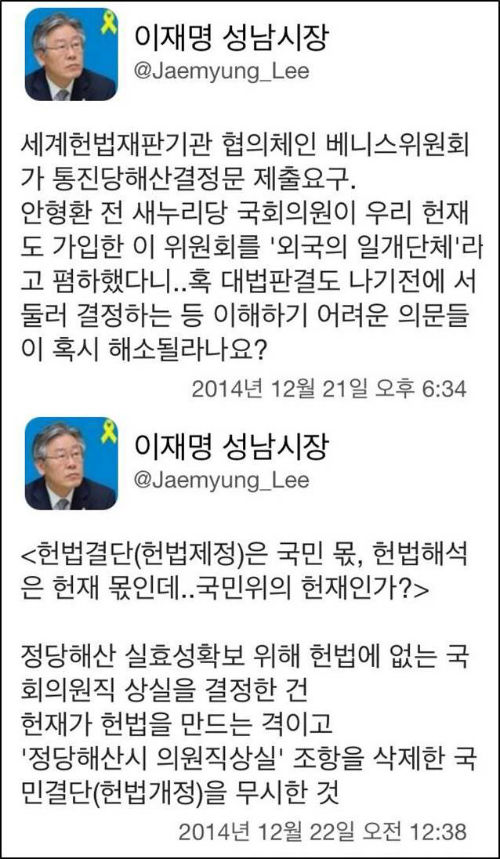 이 시장은 22일에도 “헌법개정으로 ‘정당해산 시 의원직 상실’ 조항이 삭제된 건 정당 해산해도 의원직 유지한다는 뜻인데?”라면서 “헌법결단(헌법제정)은 국민 몫, 헌법해석은 헌재 몫인데.. 국민 위의 헌재인가”라고 지적했다.