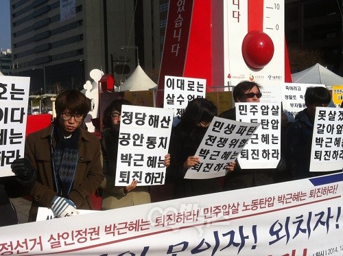 지난해 12월 31일 ‘박근혜 대통령 퇴진’을 외치며 분신했던 고 이남종 씨의 1주기를 맞아 시민 사회 단체들이 ‘박근혜 퇴진’ 투쟁 선포 기자회견을 열었다.