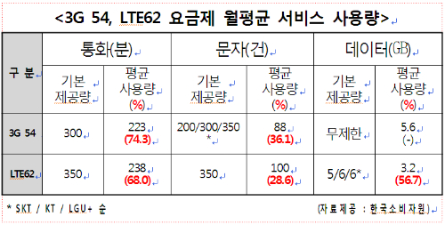 한국소비자원은 작년 11월 15일부터 26일까지 3G 및 LTE 이동전화서비스 요금제 이용자 1,511명을 대상으로 요금제별 이용실태를 설문조사했다. 조사 결과 3G 54요금제 가입 소비자의 월평균 음성통화 사용량은 기본 제공량의 74.3%, 문자서비스 이용은 36.1%에 불과한 것으로 나타났다. LTE 62요금제 사용자도 기본 제공량 중 음성통화 68.0%, 문자서비스 28.6%, 데이터통신 56.7%를 사용하고 있어 필요이상의 요금을 부담하는 것으로 밝혀졌다.