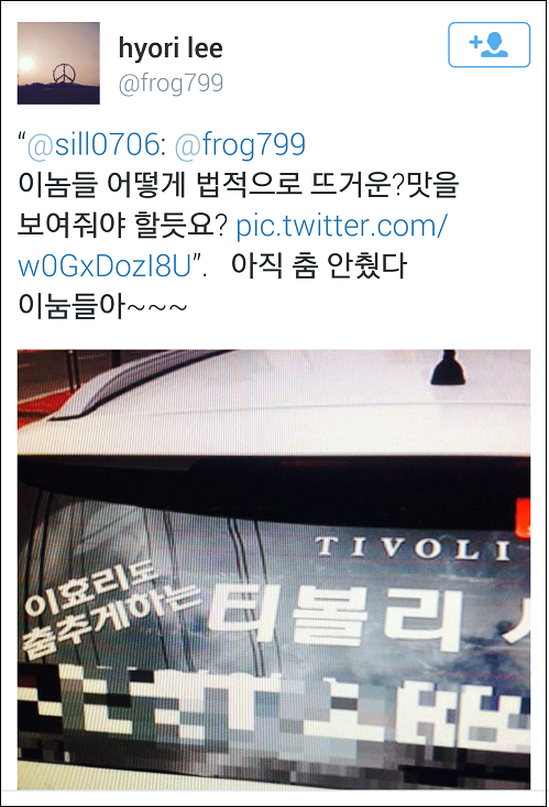16. 쌍용차 일부 영업 사원들이 해고자 복직을 염원했던 이효리씨의 발언을 활용해 신차 티볼리 광고를 하고 있는 것으로 드러나 거센 비판을 받고 있습니다. '이효리도 춤추게 하는 티볼리'라는 전단지를 보니까 하는 짓이 딱 '찌라시'구만... 하랄 때는 안하더니 말이얌.