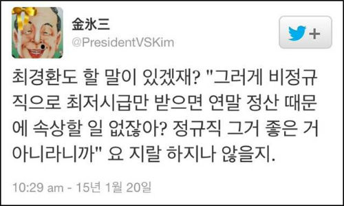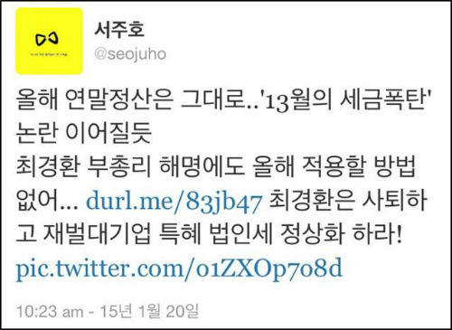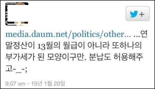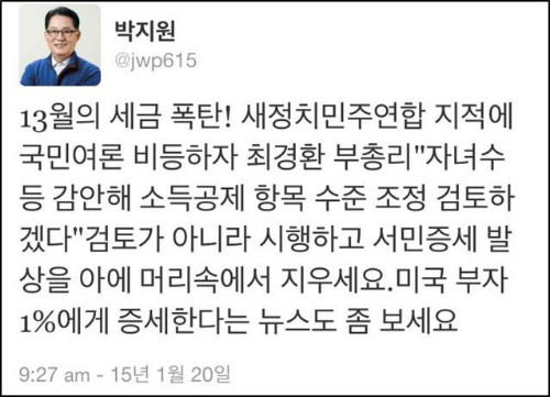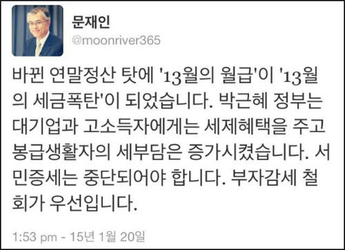 20일 문재인 새정치민주연합 의원은 자신의 트위터를 통해 “바뀐 연말정산 탓에 ‘13월의 월급’이 세금폭탄이 되었다”며 “부자감세 철회가 우선”이라고 지적했다.