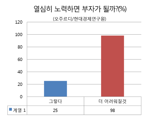 서민들은 절망한다. 계층 상승의 기회가 점차 희박해지고 있기 때문이다. 현대경제연구원이 조사(2013년)한 바에 따르면 ‘열심히 노력하면 부자가 될 수 있을까’라는 질문에 25% 만이 ‘그렇다’라고 답했다. 하지만 ‘앞으로 계층상승이 더 어려워질 것’이라고 답한 비율은 98%(2012년 조사)에 달했다. 국민 태반이 ‘아무리 노력해도 계층 상승은 불가능하다’라고 생각하다고 있다는 얘기다.