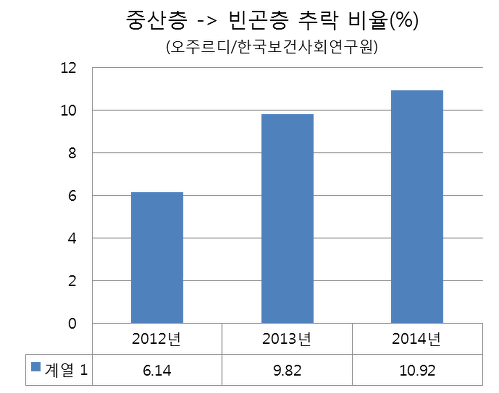 지난해 중산층 10가구 중 1가구가 저소득층으로 추락했다. 해를 거듭할수록 추락폭이 커진다. 2012년 6.1%에서 2013년 9.8%로 올랐다가 2014년에는 10.9%로 증가했다. 반면 고소득층의 추락률은 낮다. 10가구 중 8가구(77.3%)가 추락 없이 제 위치를 굳건히 지켰다.