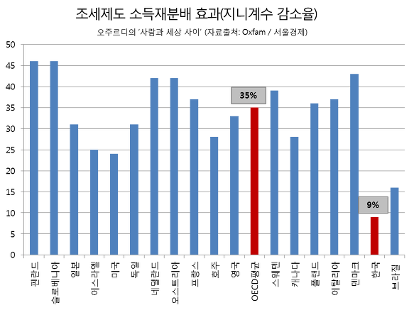 직접세 비율은 높이고 간접세 비중을 낮추면 빈부 격차가 개선되는 효과가 나타난다는 건 상식이다. 하지만 이명박-박근혜 정부는 이 상식을 거스르며 역주행해 왔다. 그 결과 지니계수감소율(조세제도로 인한 빈부격차 개선효과)은 OECD 평균(35%)의 1/4에 지나지 않는다. 조사 대상국가 중 꼴찌수준이다.