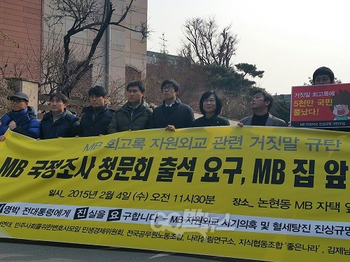 참여연대 등 6개 시민사회단체가 결성한 ‘MB자원외교 사기의혹 및 혈세탕진 진상규명을 위한 국민모임’(이하 진상규명 국민모임)이 4일 오전 서울 논현동 이명박 전 대통령 자택 앞에서 기자회견을 열고 자원외교 국정조사 청문회 증인 출석을 촉구하고 있다.