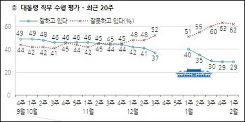 박근혜 대통령의 국정수행에 대한 지지율이 일주일 전과 같은 29%를 기록하면서 30%대 회복에 실패했다.