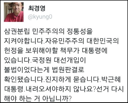 뉴스타파 최경영 기자 역시 자신의 트위터를 통해 “삼권분립 민주주의의 정통성을 지켜야 한다. 자유민주주의 대한민국의 헌정을 보위해야 할 책무가 대통령에 있다”고 지적하며 “국정원 대선개입이 불법이었다는 게 법원판결로 확인됐다”고 강조했다.
