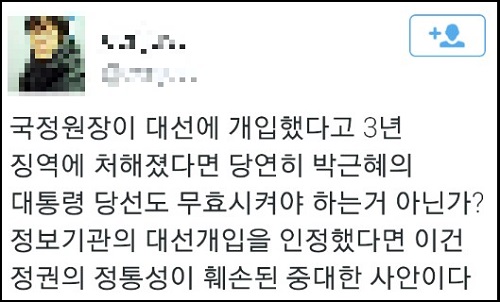 국정원 대선 개입 사건에 대해 항고심 재판부가 원세훈 전 국정원장에게 징역 3년을 선고, 정치 관여 뿐 아니라 대선에도 개입했다고 판단, 법정 구속했다. 1심과 달리 2심에서 법원이 대선 개입을 인정하면서 박근혜 대통령의 정통성에도 심각한 타격을 입게 됐다.