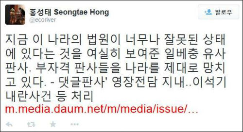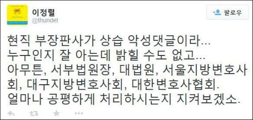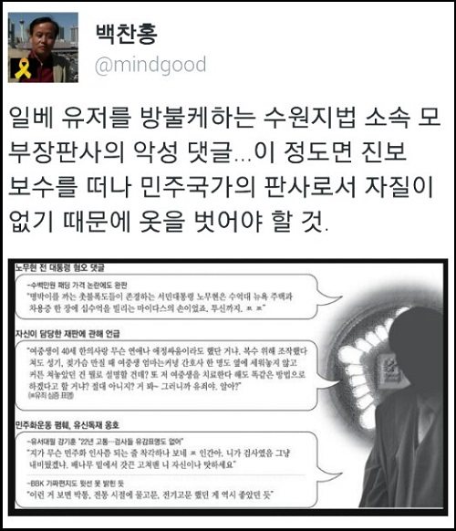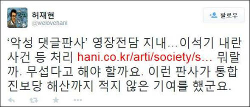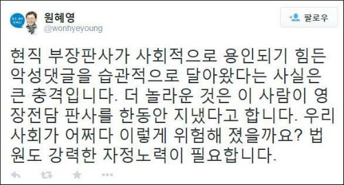 A 부장판사가 쓴 댓글 중에는 “노무현은 왜 머리통을 바위 위에 터트려 인생을 자퇴했죠?”, “촛불폭도들이 엄청 밀려든 네이버는 전라도 애들이 꽤나 몰려 있는 수도권 같은 느낌”, “전라도민을 위한 새정치. 평양정권을 위한 새정치. 이젠 세월호 유족만을 위한 새정치” 등의 악성 글들도 섞여 있어 파문이 좀처럼 가라앉지 않을 것으로 보인다.