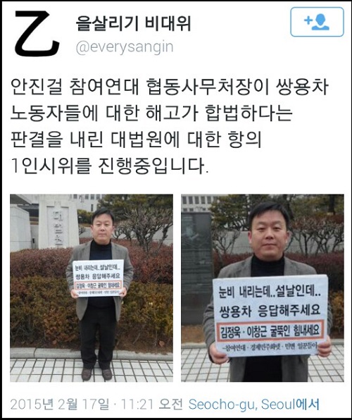 이 같은 사연은 김진숙 민주노총 지도위원의 트위터를 통해 알려졌다. 김 지도위원은 “무릎 꿇고 앉아 구걸하던 노숙남씨. 지나던 외국인이 천원을 넣자 그 돈을 제게 주면서 ‘싸요차’ 노동자들한테 전달해 달래요”라면서 ‘노숙남’ 이야기를 소개했다.