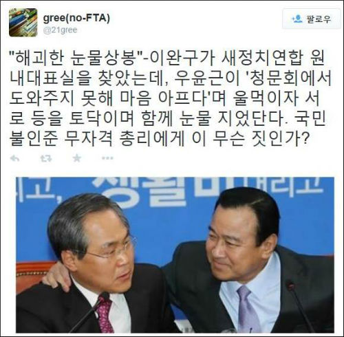 우윤근 새정치민주연합 원내대표와 이완구 국무총리가 오랜 지기와 재회한 듯 만나자마자 서로 부둥켜안고 눈물을 흘려 도마위에 올랐다.