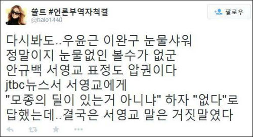 네티즌들은 “국민은 안 소중하고 니들은 소중하다 이거냐”(sjd***), “이거 뭐하는거야? 눈물나서 못보겠네 참”(설*), “개인적으로 아무리 친해도 저렇게 공개적으로 친분 과시할 필요가 있나? 2중대 소리 듣는 이유를 정녕 모르는 거냐?”(쏘렌*****),