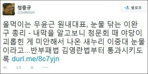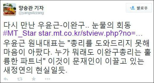 24일 우윤근 원내대표는 국회 원내대표실로 예방 온 이 총리에게 “정말 저도 마음이 아팠다. 도와드리지 못해서…”라며 눈물을 훔쳤고, 이에 이 총리는 우 원내대표의 등을 두들겨주며 함께 눈시울을 적셨다.