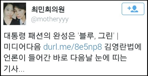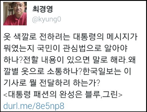 뉴스타파 최경영 기자는 이날 자신의 트위터를 통해 “옷 색깔로 전하려는 대통령의 메시지가 뭐였는지 국민이 관심법으로 알아야 하나”라면서 “전할 내용일 있으면 말로 해라. 왜 깔별 옷으로 소통하나? 한국일보는 이 기사로 뭘 전달하려 하는가”라고 따져 물었다.