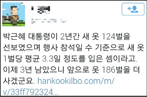 <한국일보>의 박근혜 대통령 취임 후 2년 간 입은 새 옷 124벌에 대한 색상 분석 기사가 SNS상에서 빈축을 사고 있다.